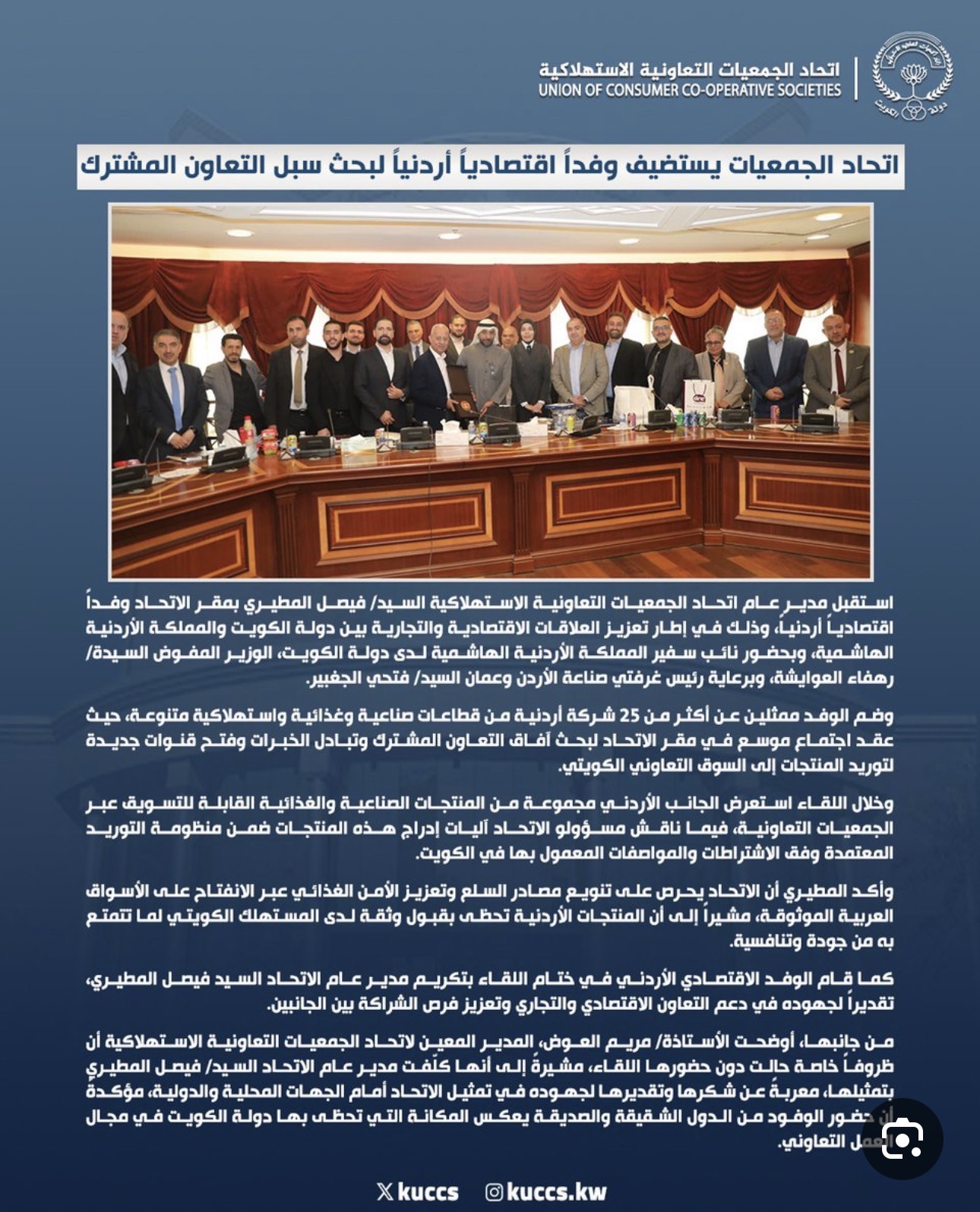 اتحاد الجمعيات التعاونية الاستهلاكية في الكويت يستضيف وفداً صناعياً أردنياً برئاسة الجغبير …