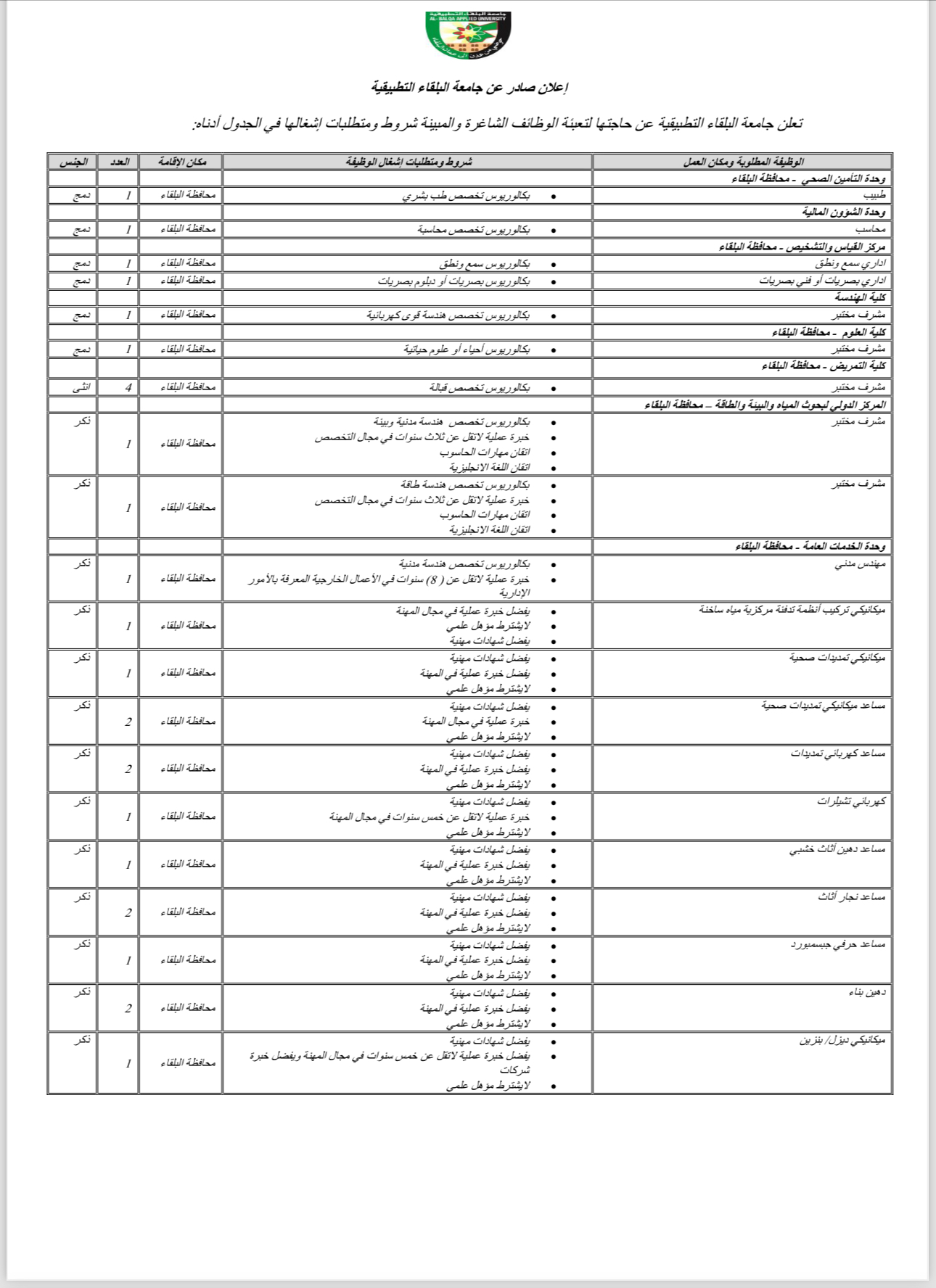 إعلان توظيف صادر عن جامعة البلقاء ..