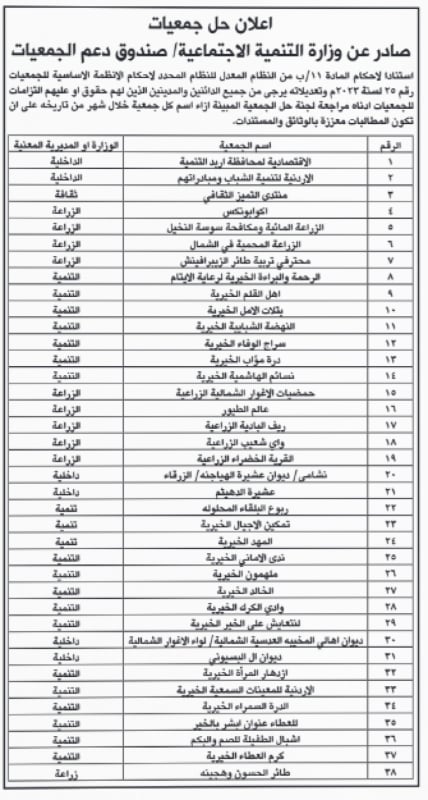 أعلنت وزارة التنمية الاجتماعية، اليوم الأحد، حلّ 38 من الجمعيات في المملكة.