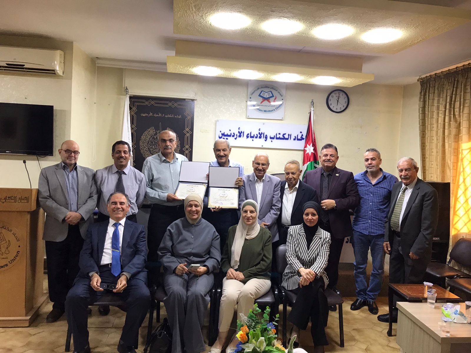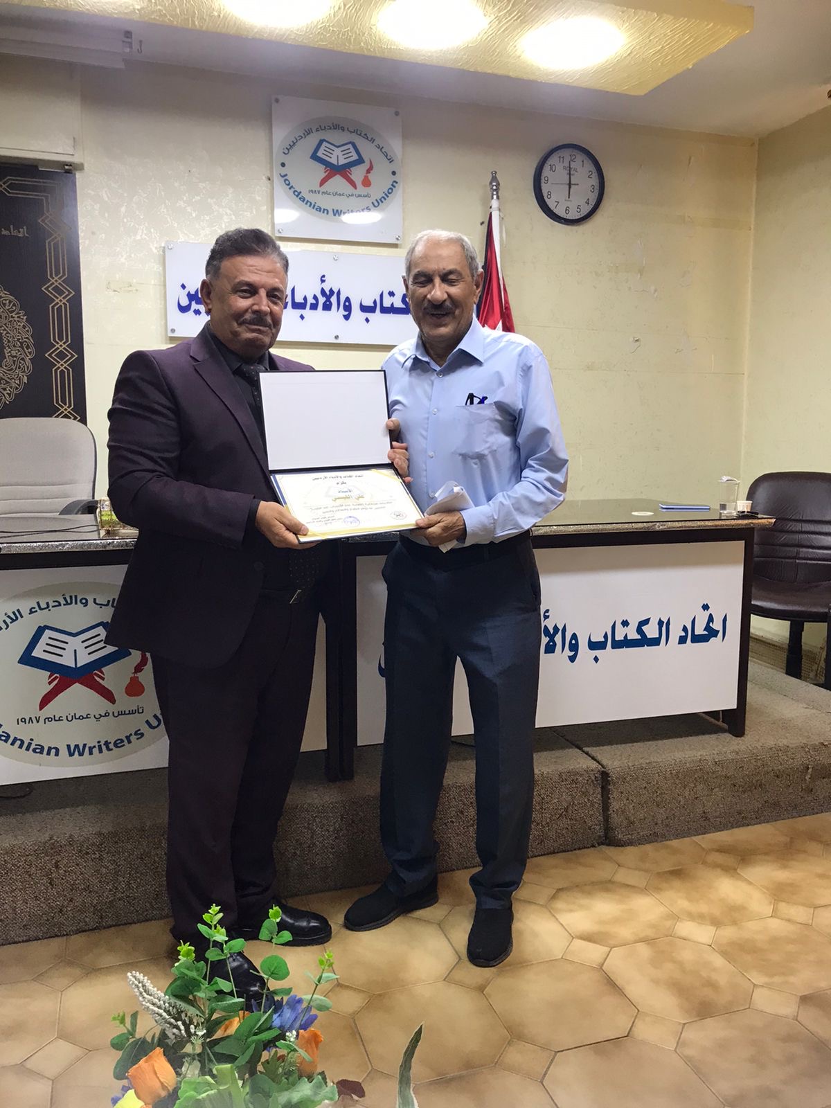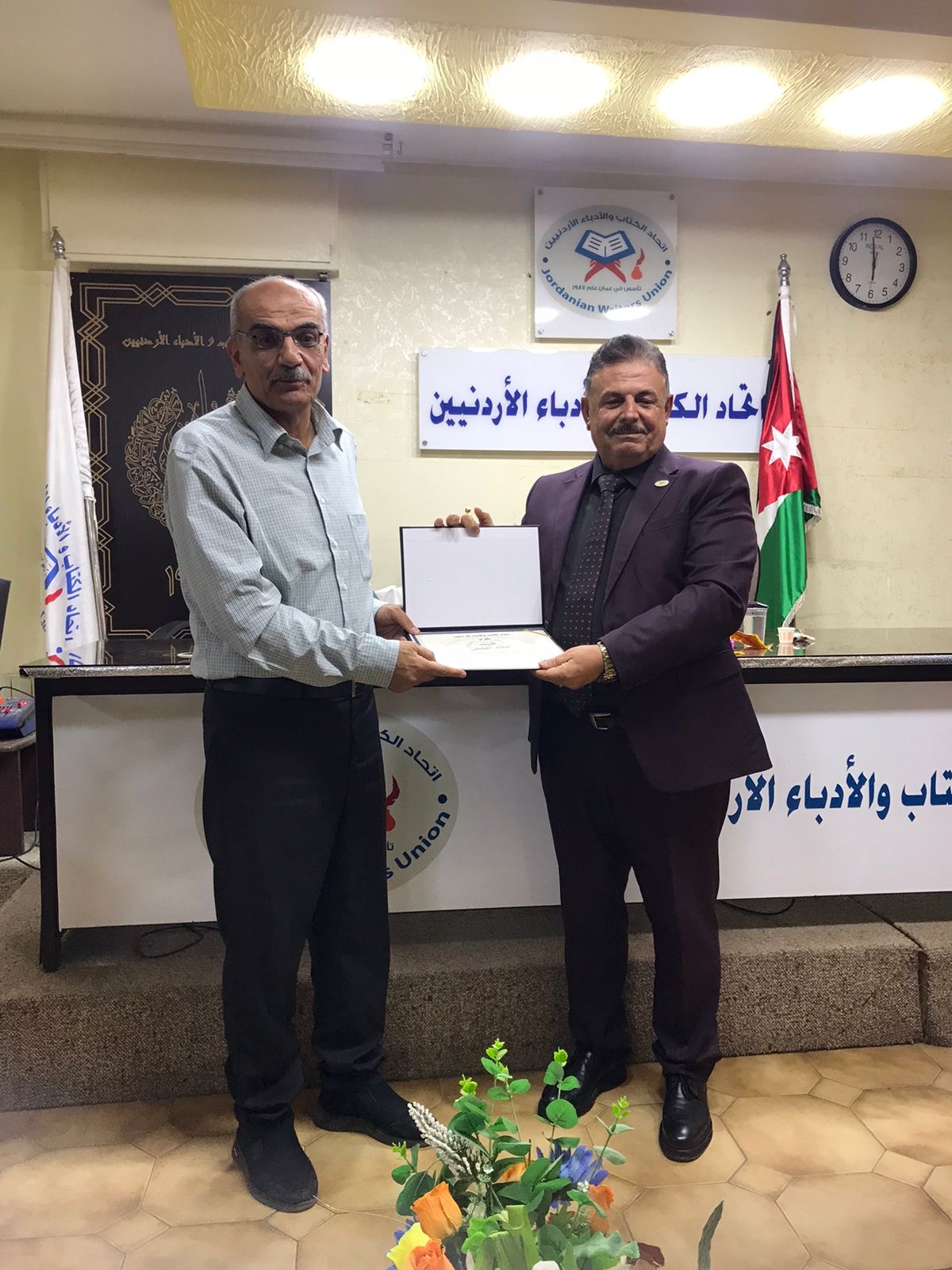 وفي نهاية الأمسية قام نائب رئيس الاتحاد عبد ربه بتكريم الباحث العقيلي والكاتب القيسي بشهادتي تقدير لهما والتقاط الصور التذكارية .