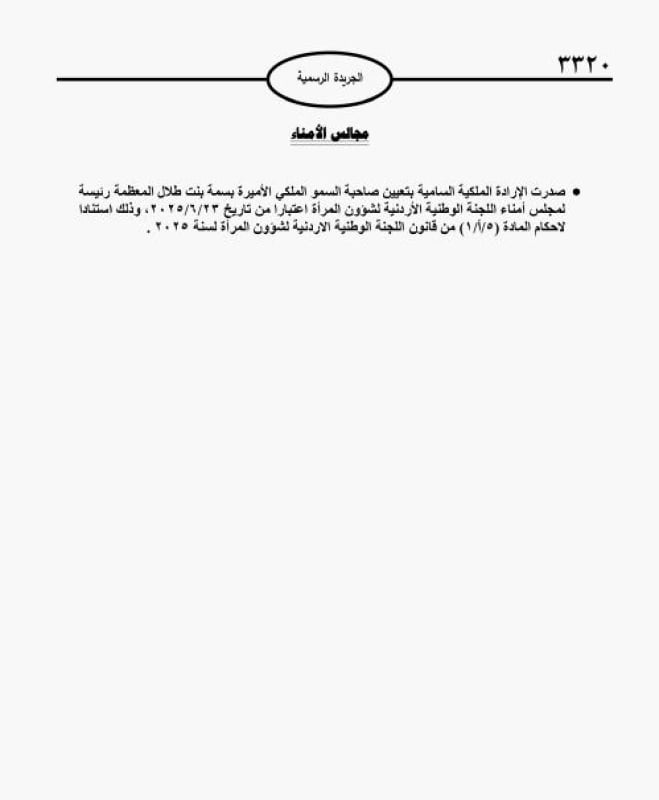 صدرت الإرادة الملكية السامية، تعيين الأميرة بسمة بنت طلال رئيسة لمجلس أمناء اللجنة الوطنية الأردنية لشؤون المرأة، اعتبارا من تاريخ 23-6-2025.
