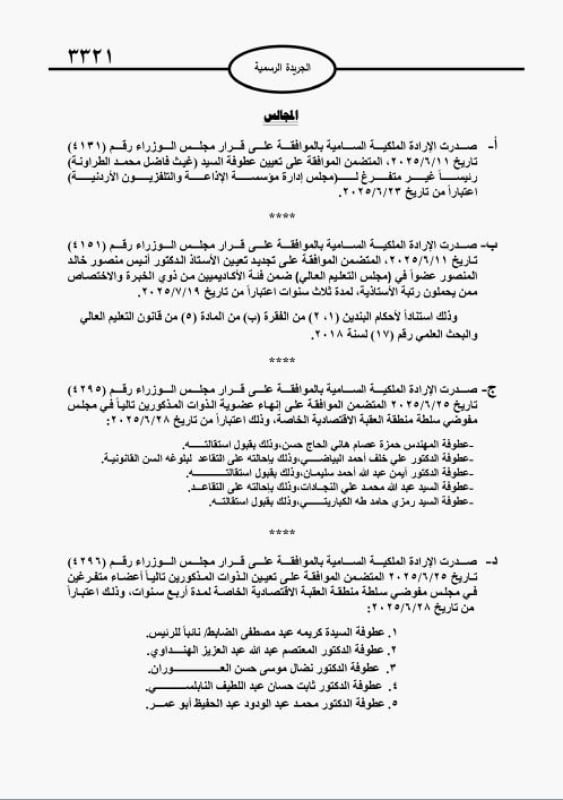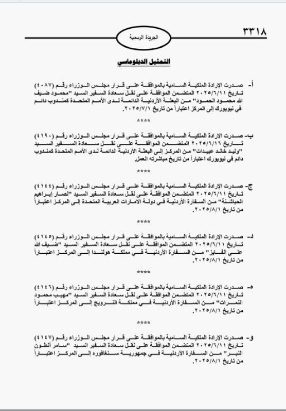 كما صدرت ارادة بالسفراء الحمود وعبيدات والحباشنة والفايز والنمرات والنبر والعموش والخوري.