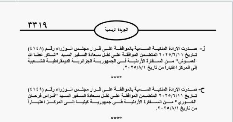 وصدرت الإرادة الملكية السامية بالموافقة على قرار مجلس الوزراء بنقل السفير شاكر العموش من السفارة الأردنية في الجمهورية الجزائرية إلى المركز، ونقل السفير فراس الخوري من السفارة الأردنية في جمهورية كينيا إلى المركز.