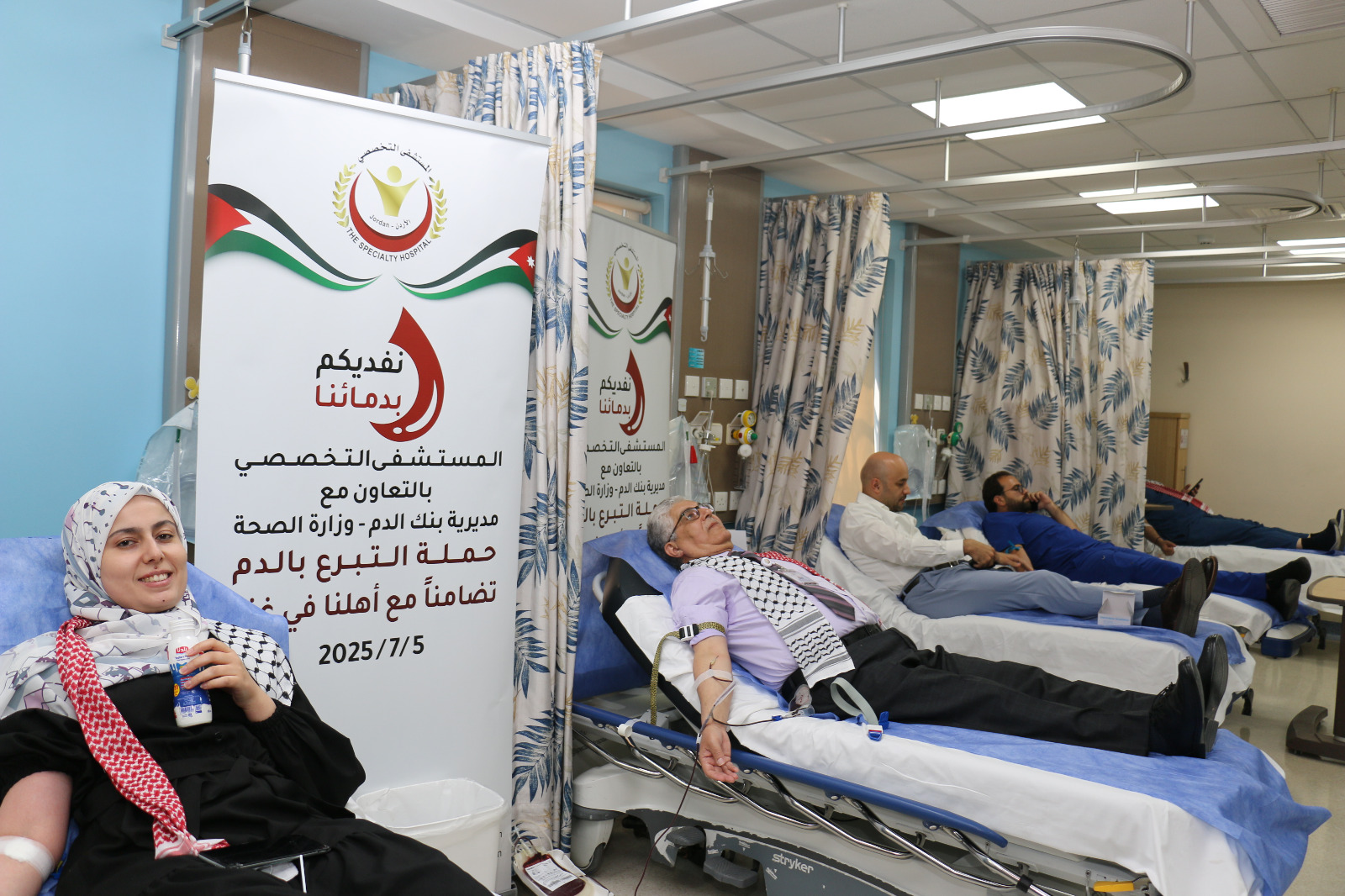 انطلقت في المستشفى التخصصي، امس،، حملة تبرع بالدم تحت شعار «نفديكم بدمائنا»، دعمًا للأهل في قطاع غزة.ونُظمت الحملة بالتعاون بين المستشفى التخصصي، ومديرية بنك الدم في وزارة الصحة، والخدمات الطبية الملكية، وتهدف إلى جمع أكبر عدد ممكن من وحدات الدم لتعويض النقص الشديد في القطاع، في وقت أصبح فيه وجود متبرعين في غزة شبه مستحيل، بسبب سوء التغذية الذي يعاني منه سكان القطاع نتيجة الحصار الجائر، ومنع دخول المساعدات الغذائية والطبية.وشهدت الحملة توافدا شعبيا كبيرا لاسيما من فئة الشباب.وقال رئيس جمعية المستشفيات الخاصة، ومدير عام المستشفى التخصصي، الدكتور فوزي الحموري، إن هذه المبادرة الإنسانية والوطنية تأتي امتدادًا لمواقف الأردن الثابتة، بقيادة جلالة الملك عبدالله الثاني، في نصرة الشعب الفلسطيني وقضيته العادلة، وتخفيفًا لمعاناة أهل غزة، وتضامنًا معهم في ظل الحصار الخانق والنقص الحاد في وحدات الدم، ما يجعل التبرع اليوم أكثر من مجرد واجب، بل رسالة حياة. واشار لـ» الدستور» ان مستشفيات قطاع غزة متهالكة جدا بسبب نقص المستلزمات والاودية وكل مقومات إدارة المستشفيات التي تحتاج إلى 3 الاف وحدة دم في ظل الإصابات الكبيرة والخطيرة ولا توجد إمكانيات لفتح المجال أمام أهالي القطاع بسبب الظروف وما يعانونه من سوء التغذية أو ندرة الغذاء.واضاف ان هذه الحملة هي عنوان لاختلاط دمائنا مع اشقائنا في القطاع ، مثمنا مشاركة أبناء وبنات الوطن في الحملة، مشيدًا بروح العطاء التي لطالما ميّزت الأردنيين في كل موقف إنساني.من جانبه قال شكر مدير مديرية بنك الدم الدكتور علاء سلامة المجتمع المحلي والمستشفى التخصصي الذي عمل على تهيئة العملية التنظيمية لهذه الحملة.