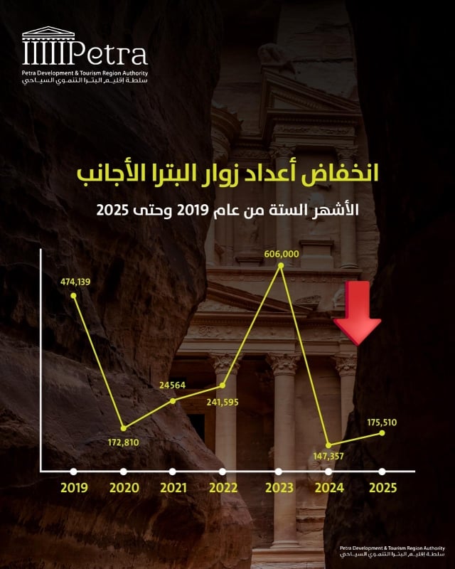 وكشفت الأرقام الرسمية الصادرة عن سلطة إقليم البترا التنموي السياحي عن تراجعاً كبيراً في أعداد الزوار، لاسيما الأجانب، حيث زار المدينة خلال شهر حزيران الماضي نحو 16,207 زائر أجنبي، بينما بلغ عدد الزوار الأجانب في حزيران من عام 2023 حوالي 68,349 زائر، وفي عام 2019 نحو 53,888 زائر أجنبي.