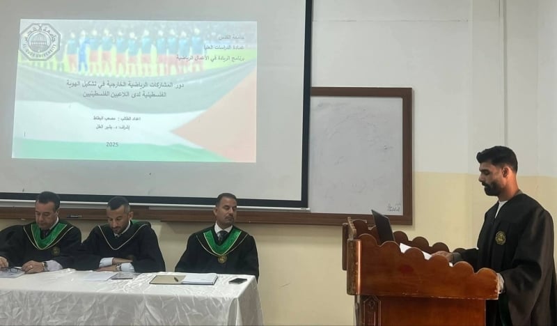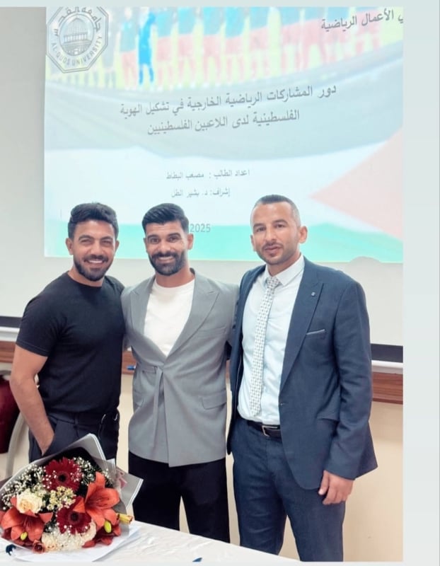 وأنهى البطاط، الذي يحترف حالياً في صفوف نادي الوكرة القطري، مناقشة رسالة الماجستير في جامعة القدس، والتي حملت عنوان: "دور المشاركات الرياضية الخارجية في تشكيل الهوية الفلسطينية لدى اللاعبين الفلسطينيين."