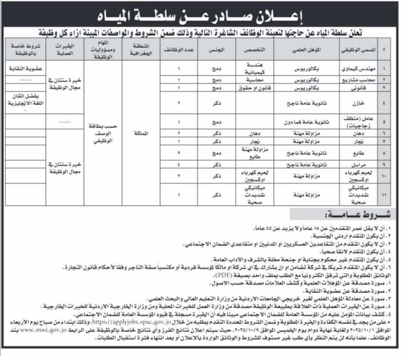 طلبت سلطة المياه موظفين ذكور وإناث للتعيين في التخصصات والمهن المدرجة في جدول ادناه بشرط أن لا يقل العمر عن 18 عام ولا يزيد عن 45 عام . 1_ هندسه كيميائية 2_ محاسبة 3_قانون _وظائف ثانوية عامة فما دون (فئة ثالثه) 1_ خازن 2_عامل منظف زجاجيات 3_نجار 4_دهان 5_طابع 6_مراسل 7_ لحيم كهرباء أوكسجين 8_ميكانيكي تمديدات صحية 6_دهان +نجار يبدأ تقديم الطلبات من صباح يوم الأربعاء 1\10\