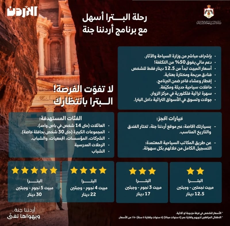 وبحسب الإعلان الرسمي، توفر الحملة دعما حكوميا يغطي أكثر من 50% من التكلفة الفعلية للرحلة، ما يتيح للمواطنين الاستمتاع بزيارة مدينة البترا والإقامة فيها بأسعار تبدأ من 12.5 دينار فقط للشخص كما هو مبين في الاعلان ادناه عبر موقعنا: