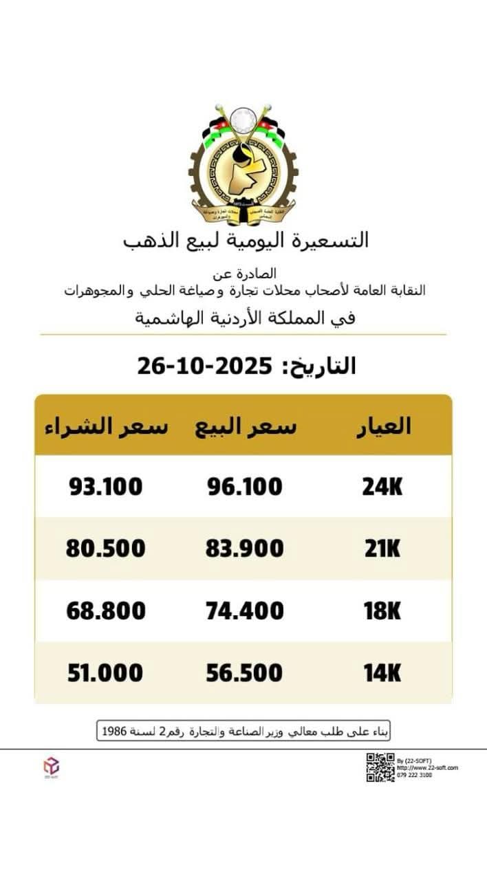 وحسب النشرة التي أصدرتها النقابة العامة لأصحاب محالّ تجارة وصياغة الحلي والمجوهرات، بلغ سعر الغرام الواحد من الذهب عيارات 24 و18 و14 لغايات البيع من محالّ الصاغة عند 96.1 و74.4 و56.5 دينارا على التوالي.