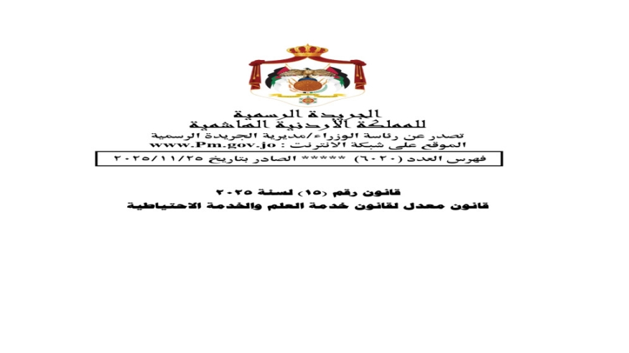 نشرت الجريدة الرسمية في عدد خاص،القانون المعدل لقانون خدمة العلم والخدمة الاحتياطية، بعد إقراره من مجلسي النواب والأعيان، ليصبح نافذاً من تاريخ نشره.