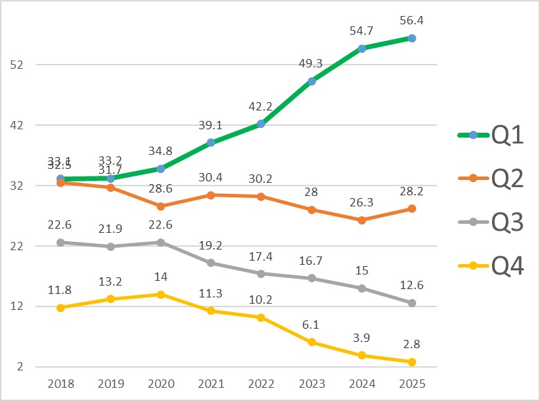 • جودة النشر: وصلت نسبة الأبحاث المنشورة في أرقى المجلات العالمية المصنفة ضمن الفئتين (Q1 & Q2)إلى 84.6% من إجمالي المنشورات ، مقارنة ب 81% عام 2024.