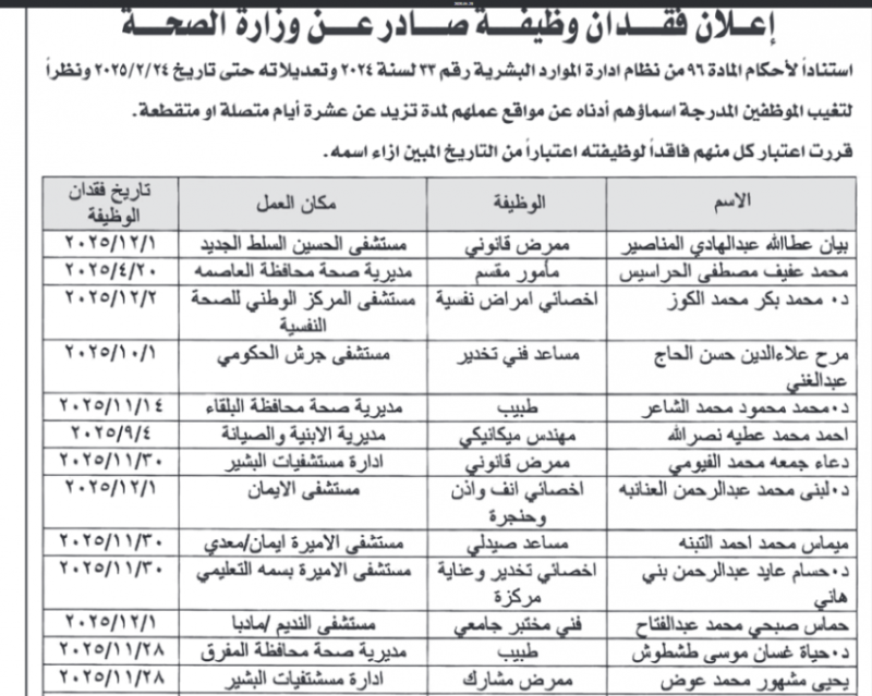 كذلك فقد أعلنت وزارة الصحة أسماء عدد من الموظفين الذين فقدوا وظائفهم لدى الوزارة.
