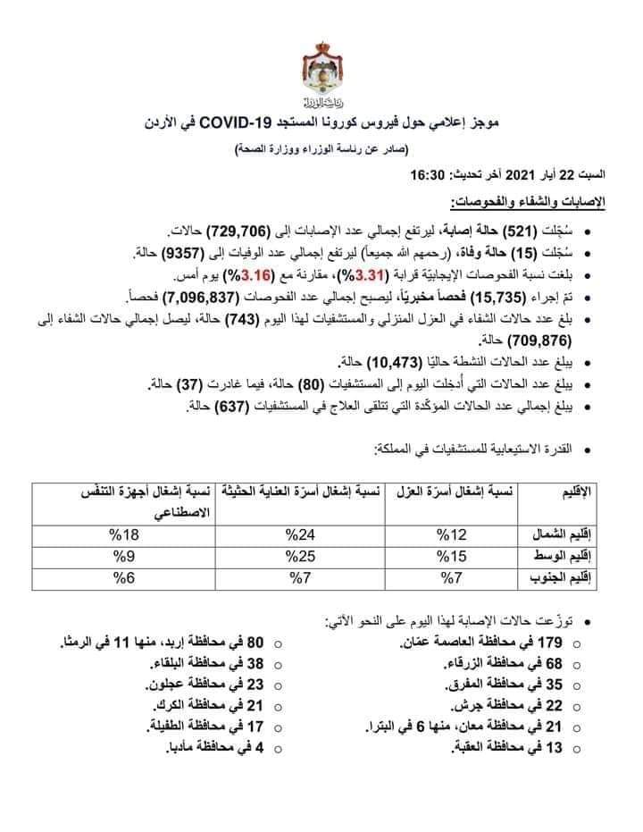 سُجِّلت (521) حالة إصابة بفايروس كورونا و سُجّلت (15) حالة وفاة، (رحمهم الله جميعاً)