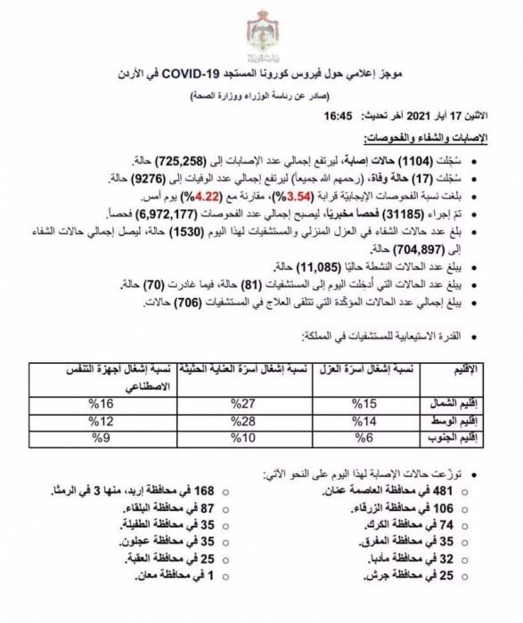 سُجِّلت (1104) حالات إصابة في فايروس كورونا و (17) حالة وفاة، (رحمهم الله جميعاً)