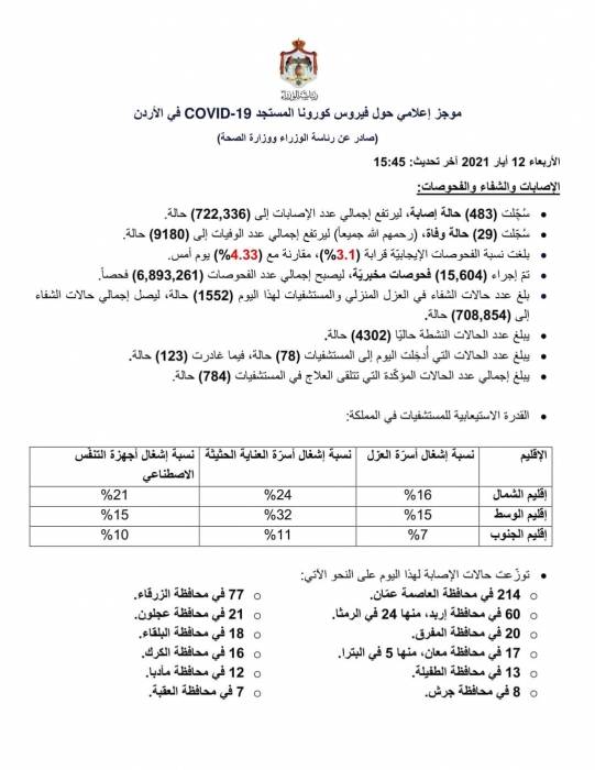 سجلت اليوم 483حالة إصابة بفايروس كورونا وسجلت 29 وفاة (رحمهم الله جميعاً)