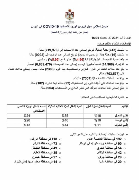 موجز إعلامي حول فيروس كورونا سُجِّلت (743) حالة إصابة و(16) حالة وفاة