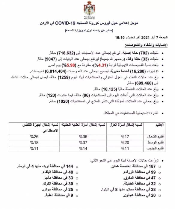 (33) حالة وفاة و (702) حالة إصابة جديدة في الاردن