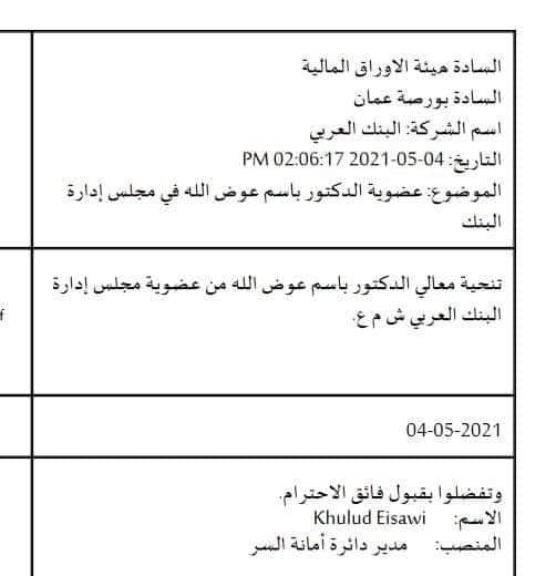 إدارة البنك العربي تقرر تنحية باسم عوض الله من عضوية مجلس إدارة البنك (وثيقة)