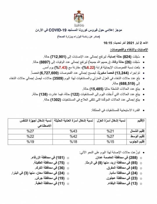 26 وفاة و 824 إصابة جديدة للكورونا في الاردن
