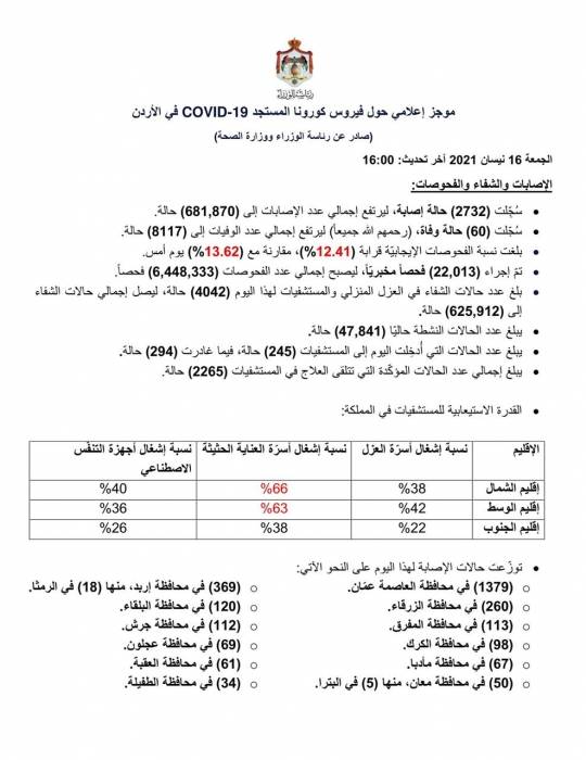 (60) وفاة و (2732) اصابة كورونا جديدة في الاردن ..