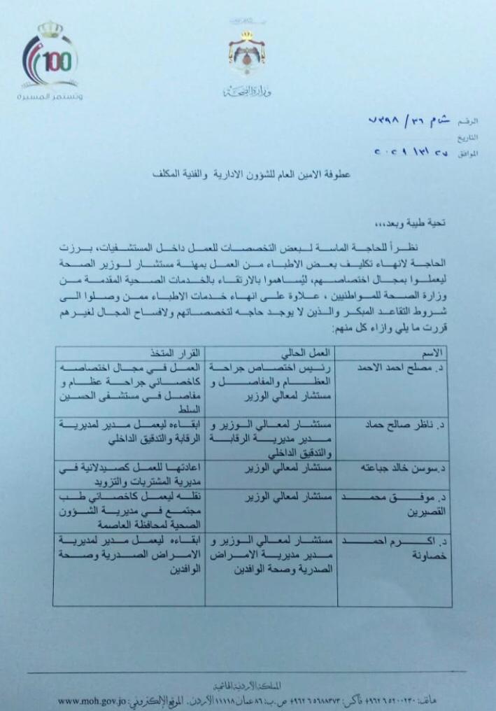 الفراية يعيد اخصائيين عملوا مستشارين لوزراء صحة سابقين للعمل الميداني لمعالجة المواطنين