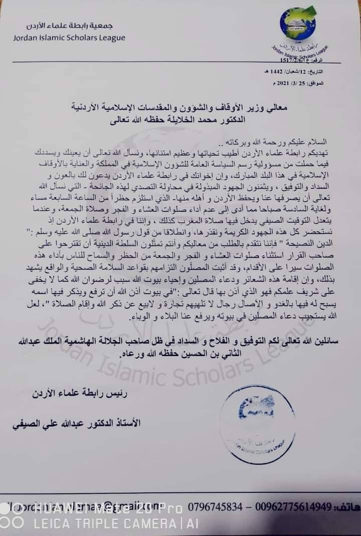 "علماء الأردن" تطالب بالسماح بصلاة الفجر و العشاء و الجمعة