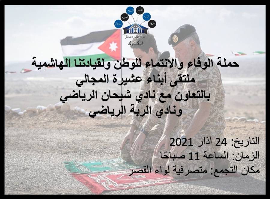 (حملة الوفاء والأنتماء للوطن وقيادتنا الهاشمية) 24 اذار يقيمها ملتقى أبناء عشيرة المجالي بالتعاون مع نادي الربة وشيحان ..