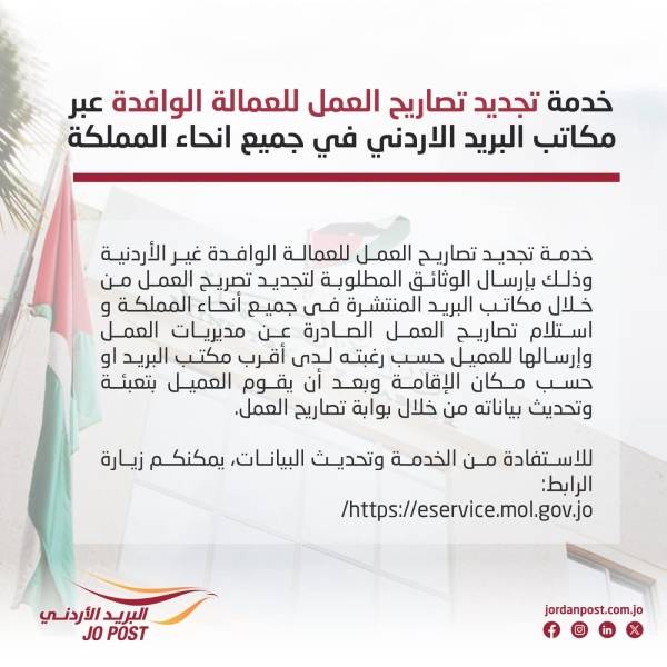 خدمة تجديد تصاريح العمل للعمالة الوافدة عبر مكاتب البريد الاردني.