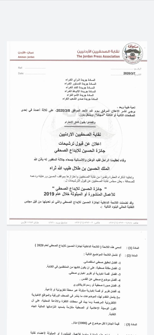 تعديلات جائزة الحسين تستثني نقيب الصحفيين من رئاسة الجائزة .