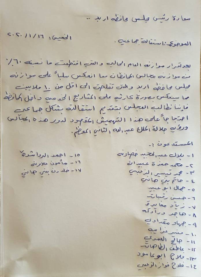بالاسماء...١٧ عضوا يطالبون مجلس محافظة اربد بتقديم استقالاتهم