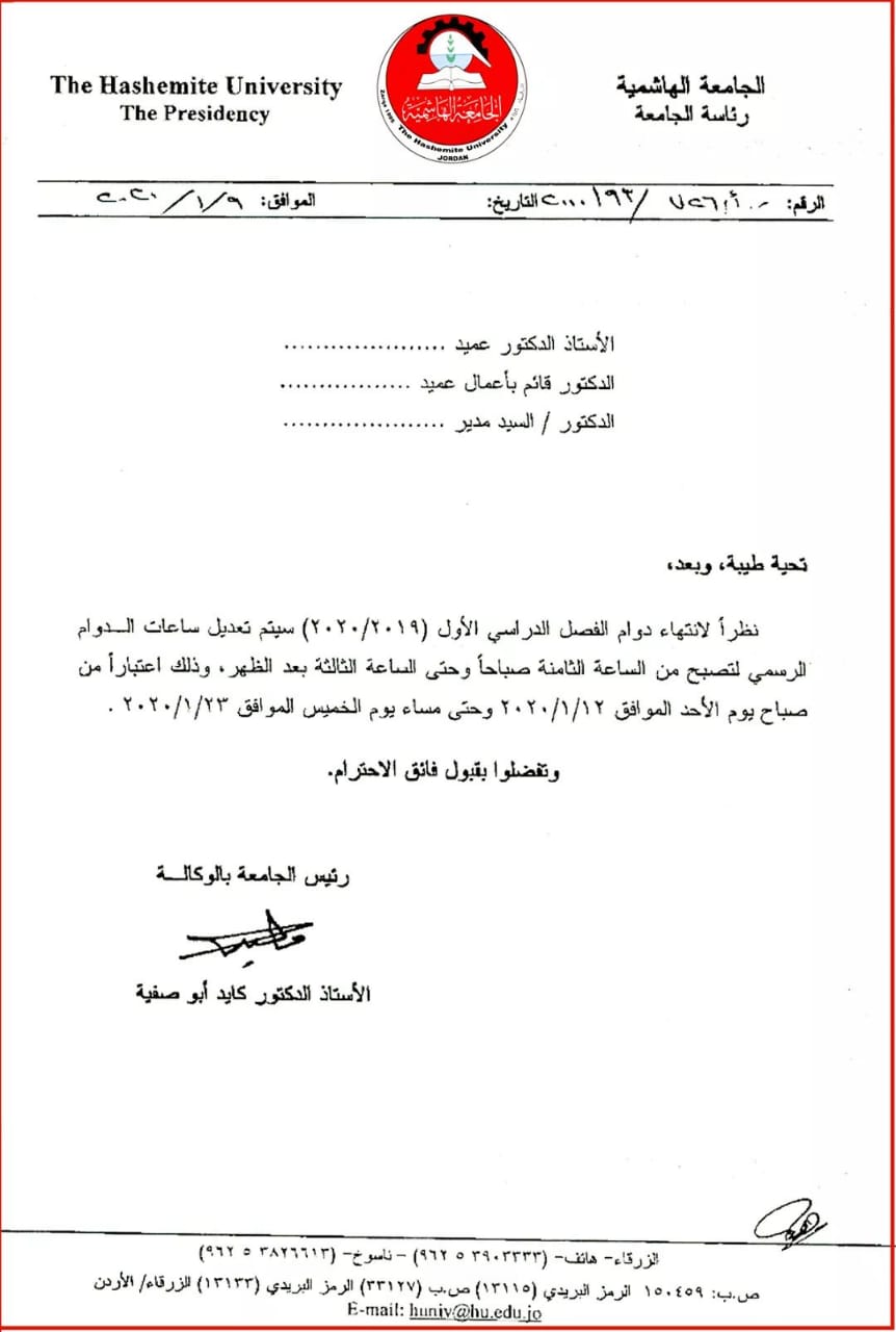 تعديل ساعات الدوام خلال عطلة ما بين الفصلين للعاملين في الجامعة الهاشمية