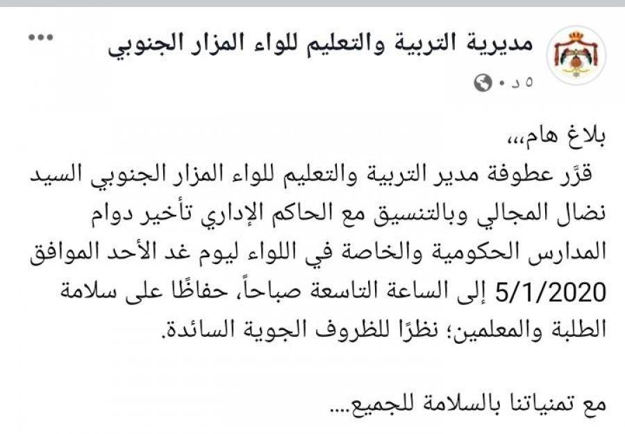 تعليق الدوام في كل من الشوبك ومعان والبادية الجنوبية