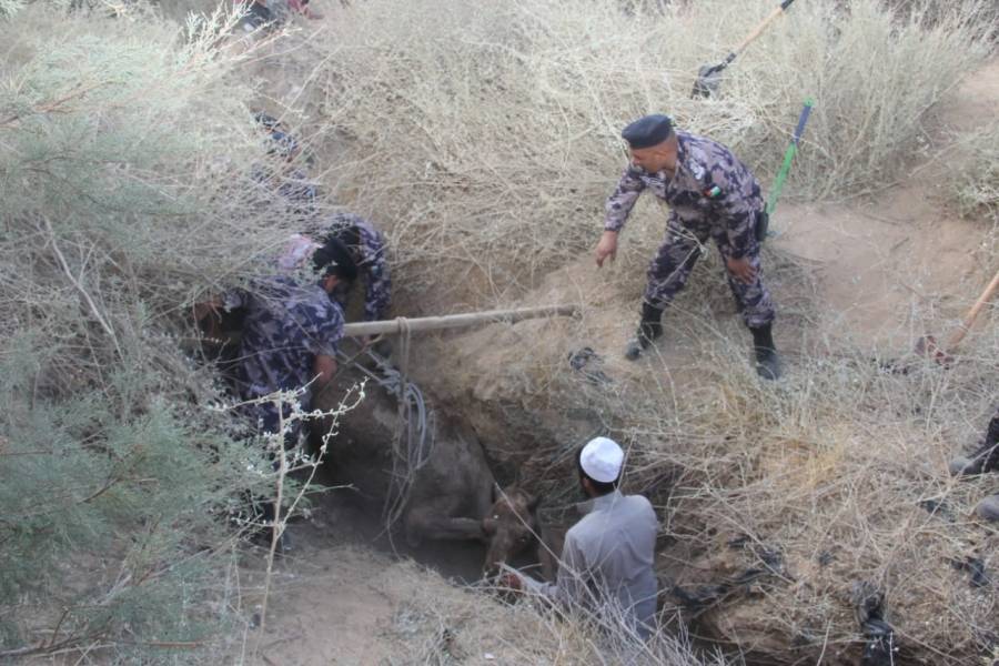 بالصور.. الدفاع المدني ينقذ جمل سقط داخل حفرة في الحسا