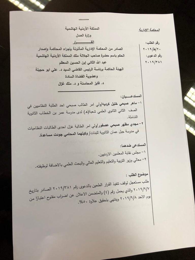 المحكمة الادارية تقرر ايقاف اضراب المعلمين / وثيقة