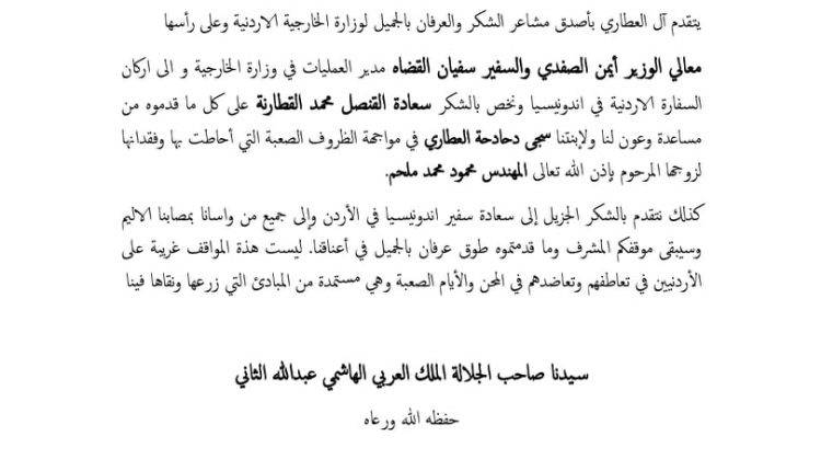 ذوو الفقيد في أندونيسيا “محمود ملحم” يشكرون وزارة الخارجية