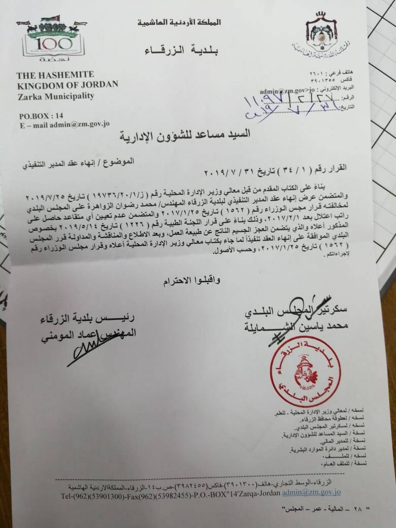 رسميآ وبقرار مجلس إنهاء عمل المدير التنفيذي لبلدية الزرقاء