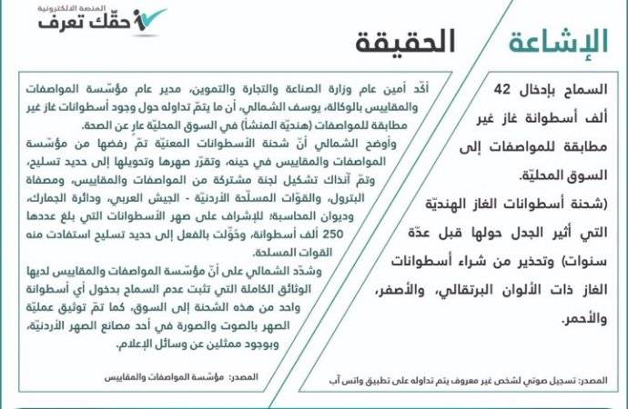 الحكومة تنفي صحة تسجيل يفيد بدخول اسطوانات غاز غير مطابقة للمواصفات