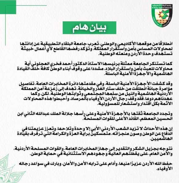 جامعة البلقاء التطبيقية تعلن إدانتها لمحاولات المساس بأمن واستقرار المملكة