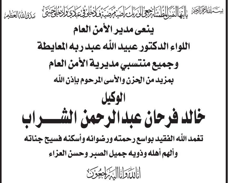 مديرية الأمن العام تنعى الوكيل خالد الشراب ..