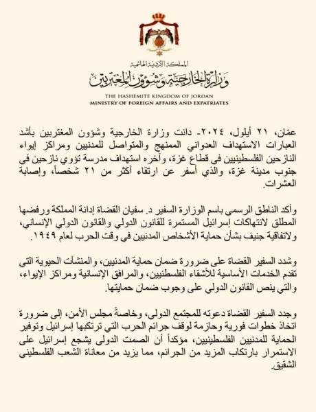 الخارجية الاردنية تدين اعتداء جيش الاحتلال على المدنيين والمدارس ومراكز الايواء ..