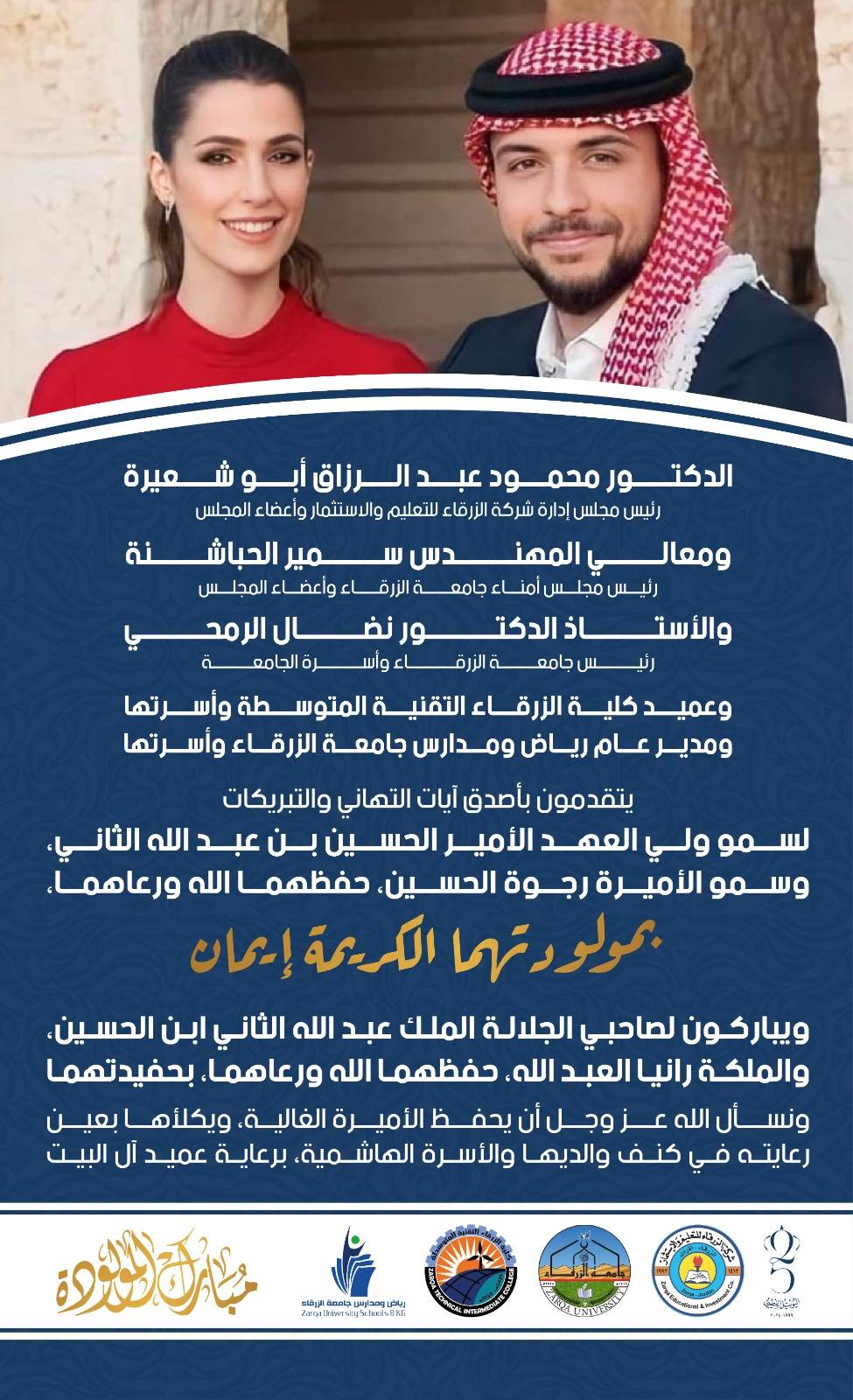 جامعة الزرقاء تهنى سمو ولي العهد المعظم والاميرة رجوة بمناسبة قدوم مولودتهم الأولى..