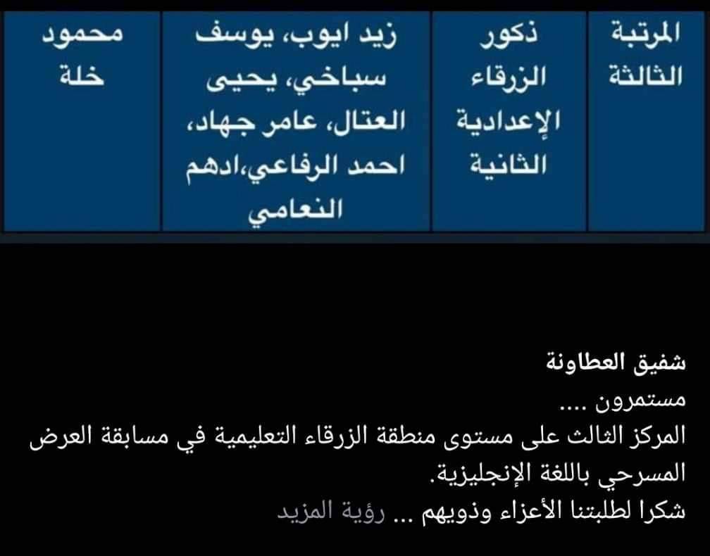 ذكور الزرقاء الإعدادية تحقق المركز الثالث بمسابقة العرض المسرحي باللغة الإنجليزية