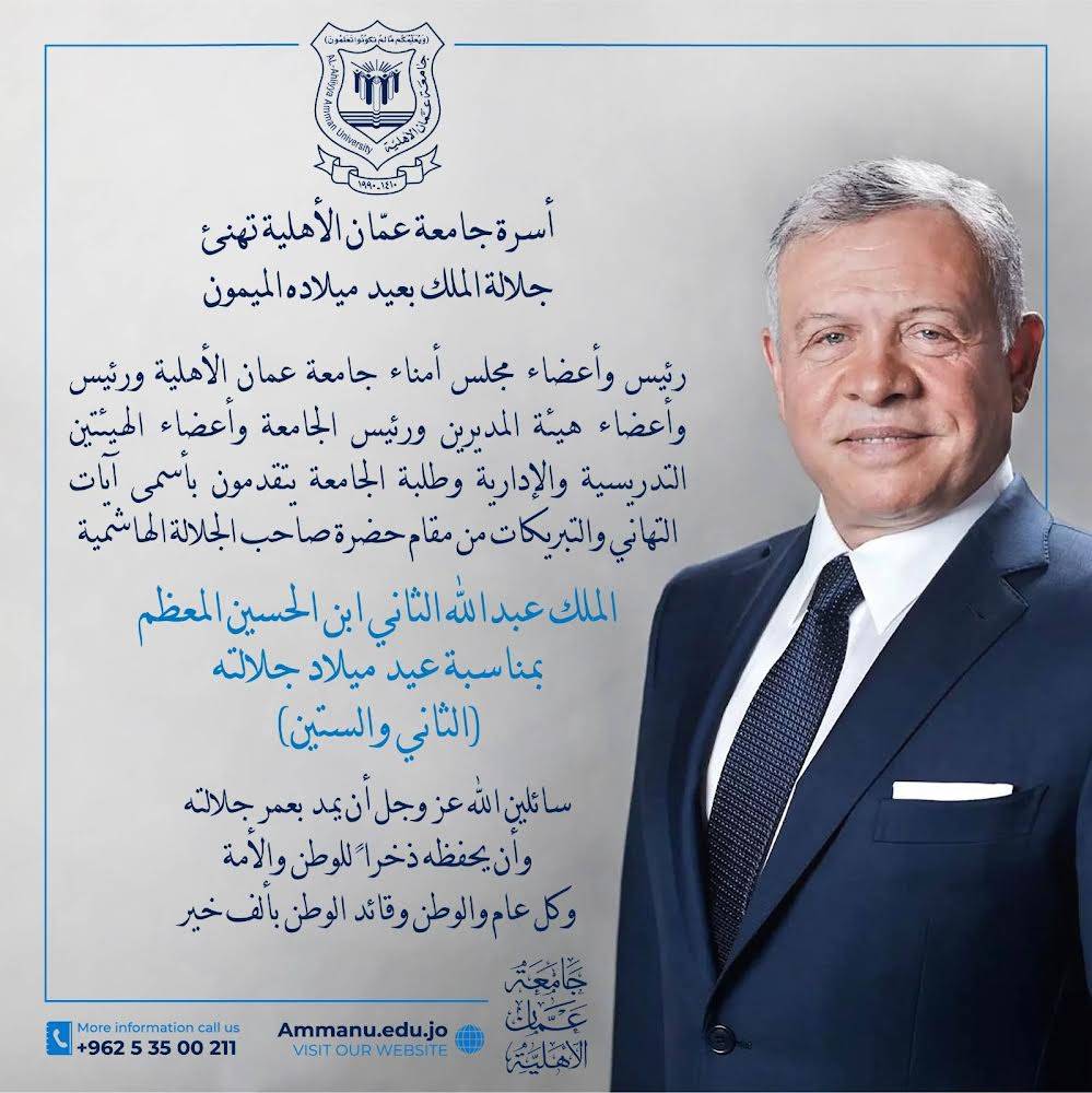 أسرة جامعة عمّان الأهلية تهنئ جلالة الملك بعيد ميلاده الميمون