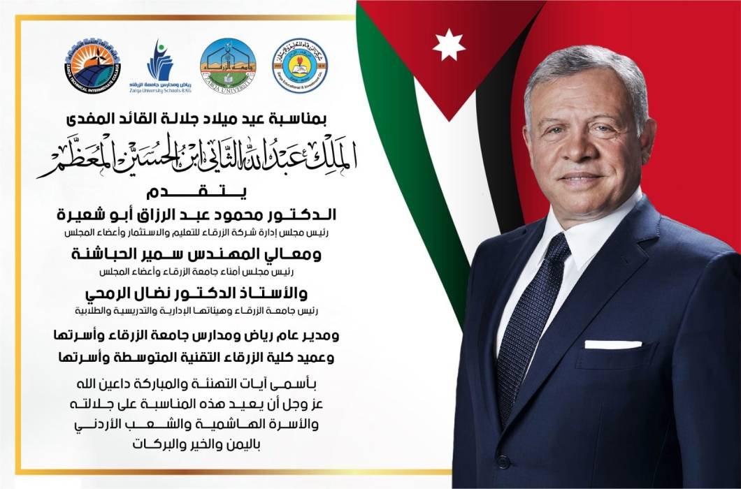 جامعة الزرقاء تهنئ جلالة الملك بعيد ميلاده الميمون ..