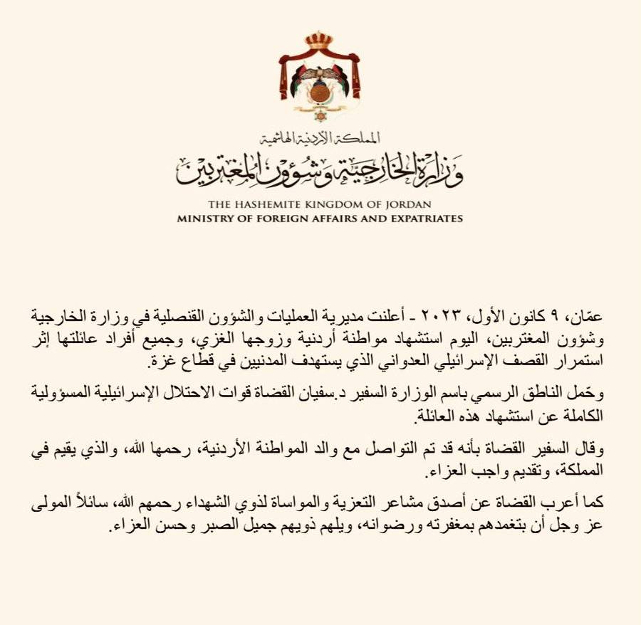 استشهاد مواطنة أردنية وعائلتها بقصف إسرائيلي في قطاع غزة