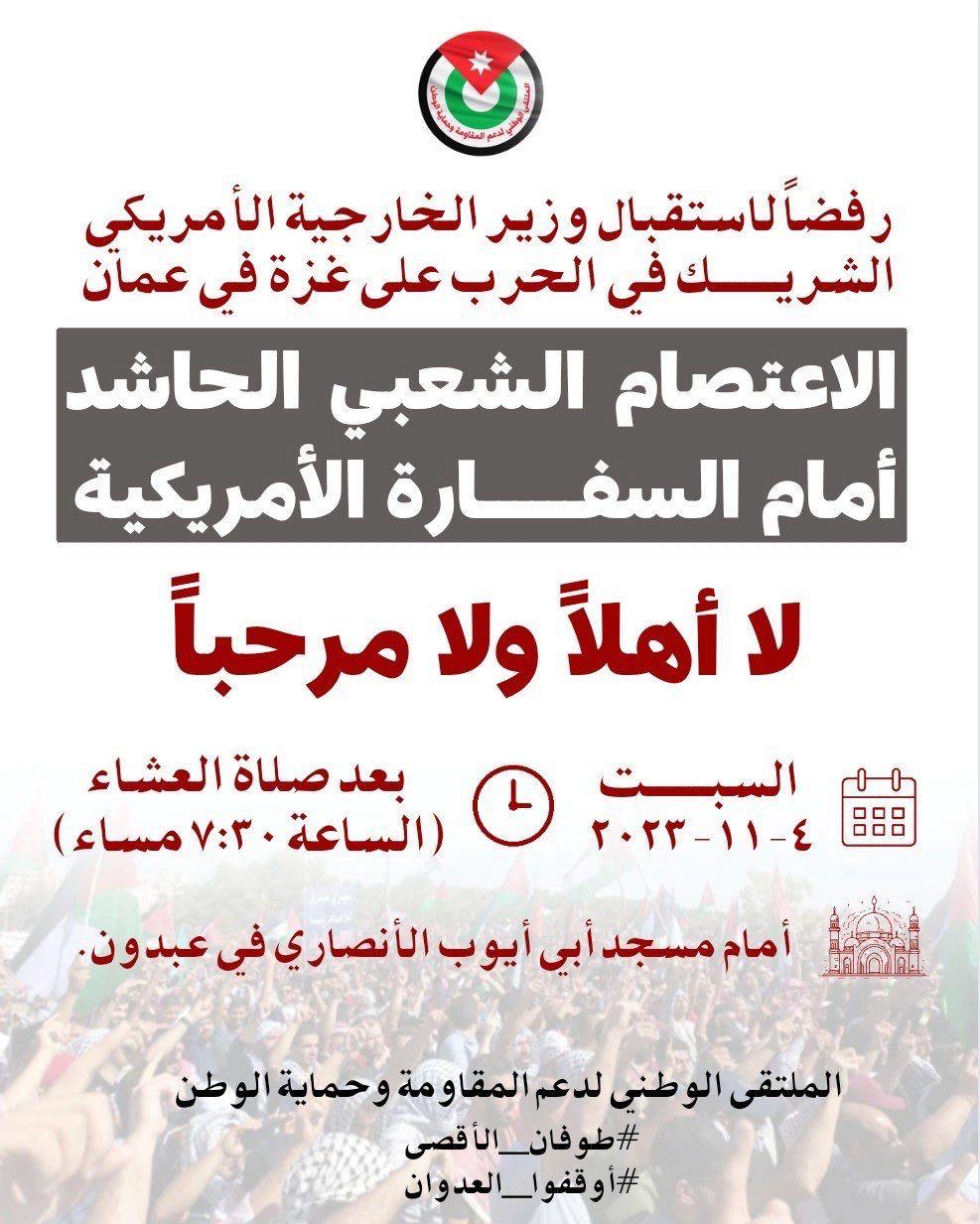الملتقى الوطني لدعم المقاومة وحماية الوطن : نزفض استقبال وزير الخارجية الأمريكي "أنتوني بلينكن" في عمان ..