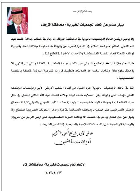 بيان صادر عن إتحاد الجمعيات الخيرية / محافظة الزرقاء..