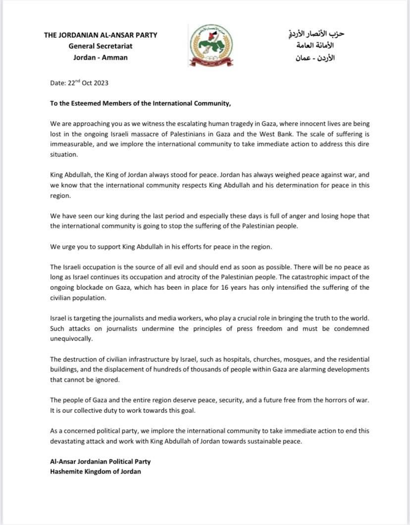 بيان باللغتين العربية والانجليزية لحزب الانصار الاردني حول خطاب جلالة الملك ..