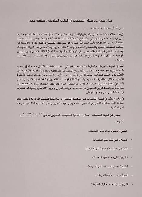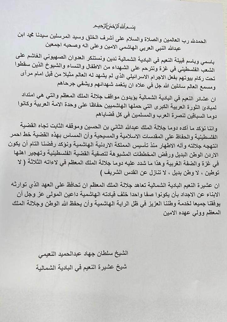 قبيلة النعيمات / البادية الجنوبية : نستهجن العدوان الوحشي على غزة ونسير على نهج القائد