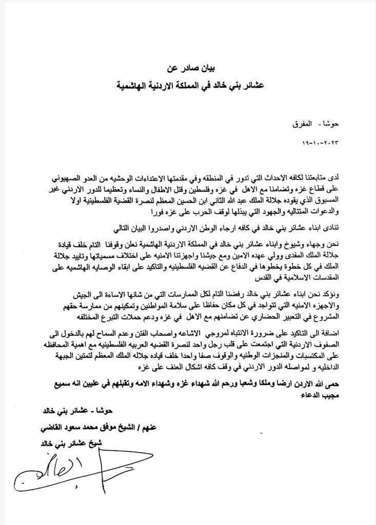 عشائر الجازي / الحويطات : نشكر جلالتكم على وقوفكم مع اشقائنا الفلسطينيين